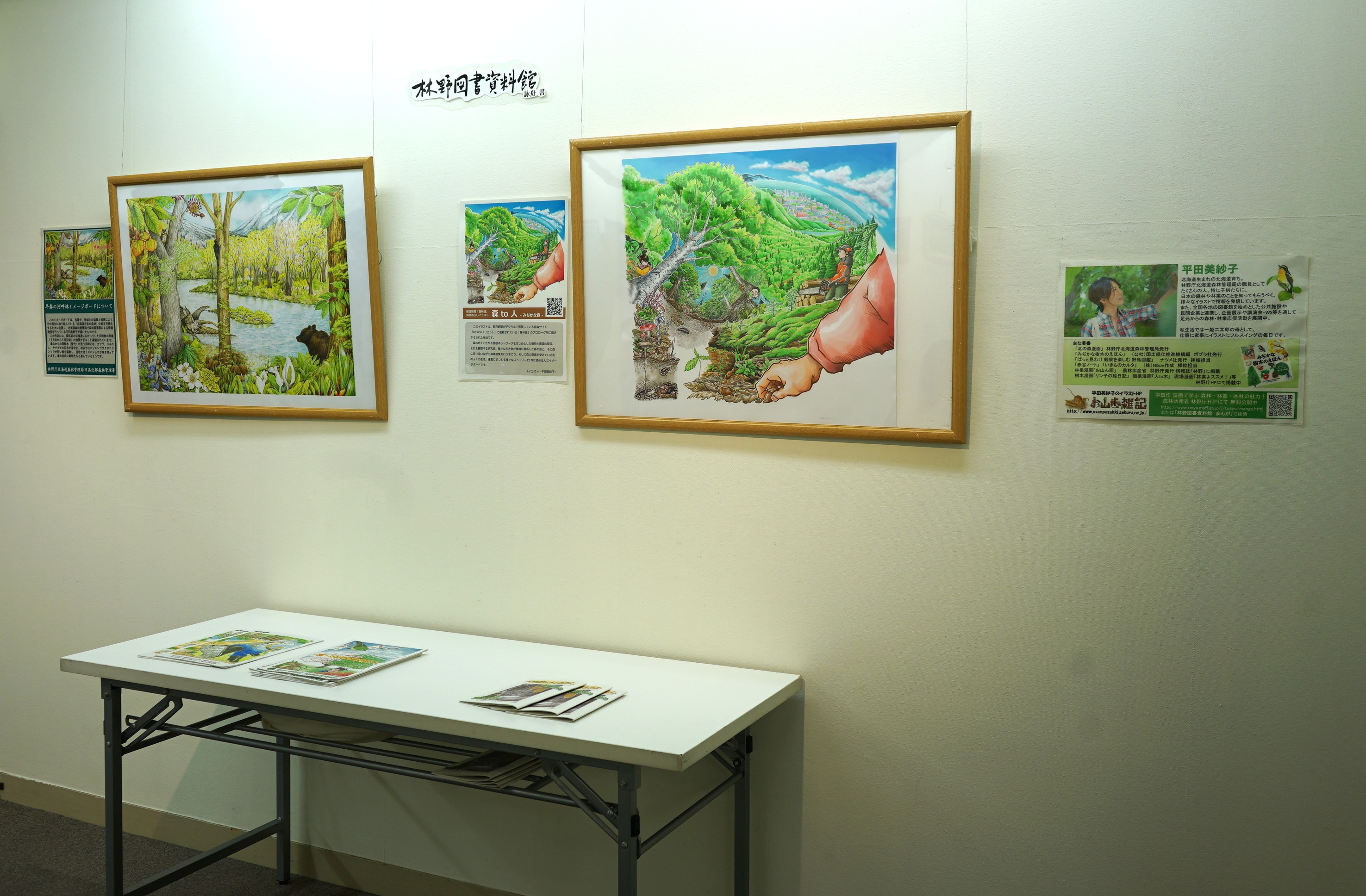 当展覧会では、林野庁のご後援を頂いており、林野庁展示コナーを2階に設けています。 展示内容は、日本山林美術協会の精神にも共通する「緑を護り、自然を愛す!」をテーマに展示しています。 具体的には、林野庁の広報を担当している、平田美紗子氏の広報作品を展示しています。 https://sankousho.haj.co.jp/interview/?interview_id=202